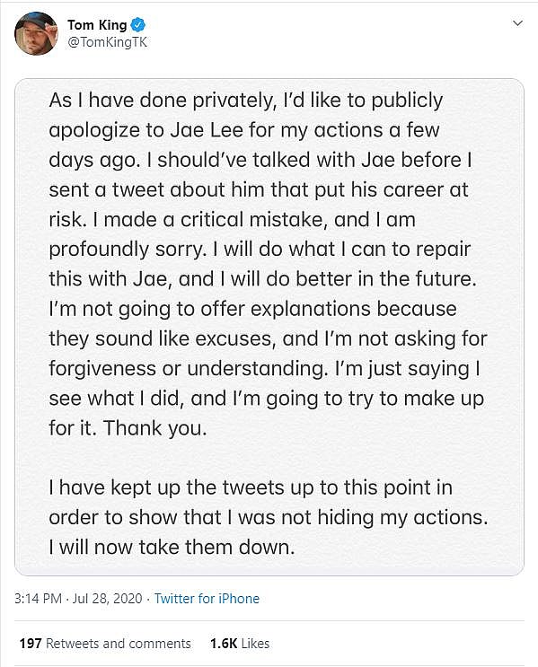 King wrote, “As I have done privately, I’d like to publicly apologize to Jae Lee for my actions a few days ago.”
