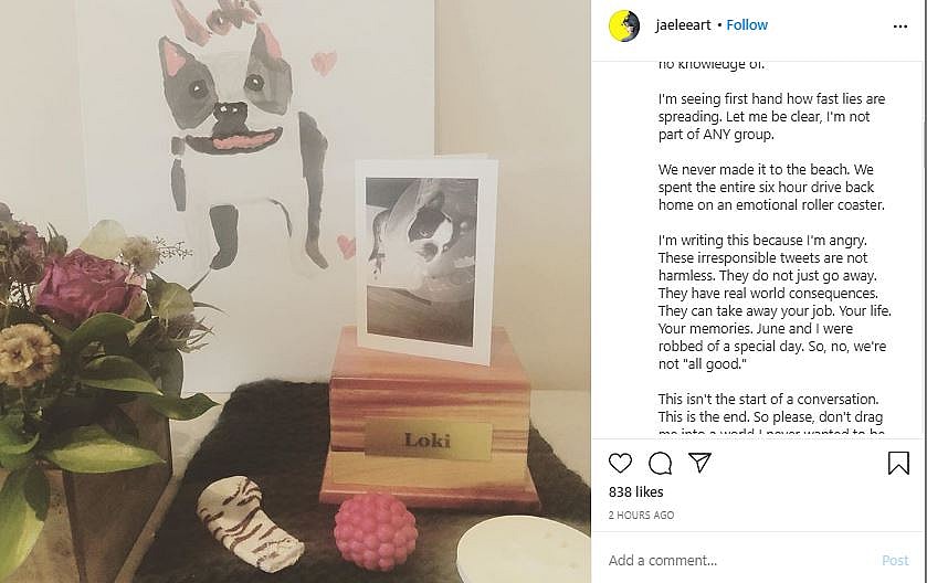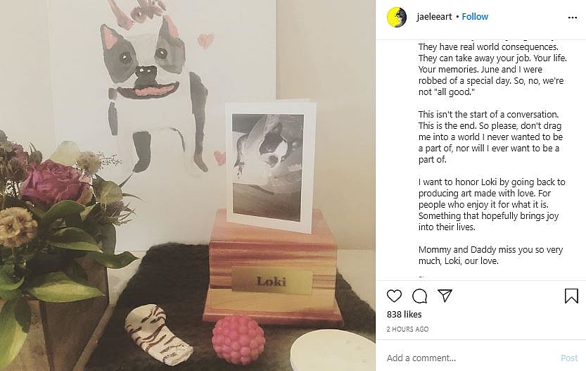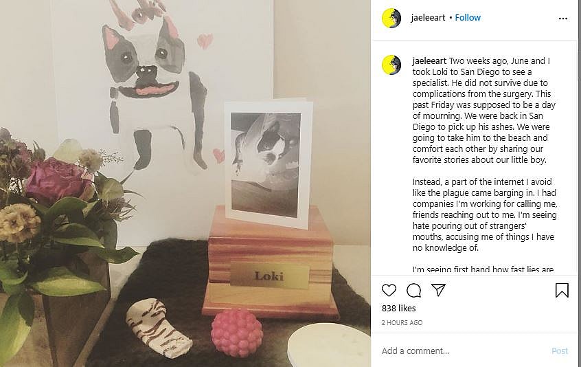 Lee wrote, “Two weeks ago, June and I took Loki to San Diego to see a specialist. He did not survive due to complications from the surgery.”