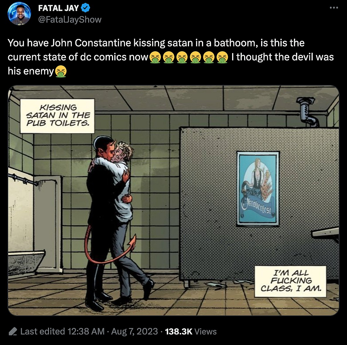 YouTuber Fatal Jay, who initially posted the image on Twitter, commented on it with confusion and sees this instance as a new low for DC. “You have John Constantine kissing satan in a bathoom, is this the current state of dc comics,” he wrote accompanied by several vomiting emojis. “I thought the devil was his enemy.”