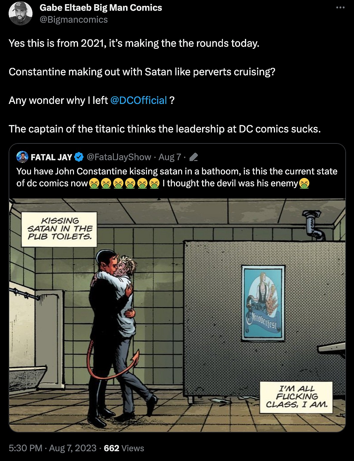 “Yes this is from 2021, [but] it’s making the rounds today,” Eltaeb wrote in a repost. “Constantine making out with Satan like perverts cruising? Any wonder why I left @DCOfficial ? The captain of the titanic thinks the leadership at DC comics sucks.” DC’s leadership is Publisher Jim Lee, whom Eltaeb has discussed his differences with in the past.