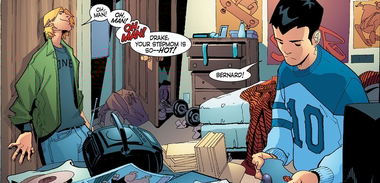 As crafted by Willingham, Bernard’s first appearance was in Robin (Volume 2) #121 in 2003. Willingham presented a page from that issue demonstrating that Bernard, while cocky, was originally into girls.
