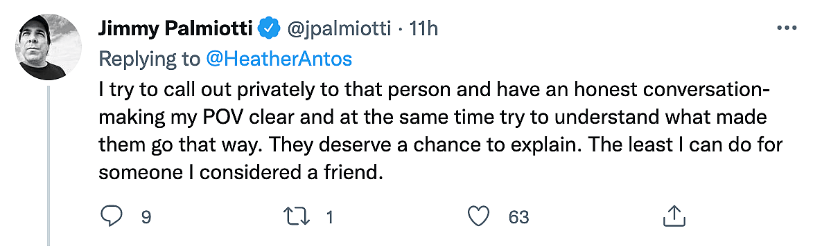 Several comic book industry professionals responded to Antos’ tweet. Jimmy Palmiotti, best known for his work on Harley Quinn, said, “I try to call out privately to that person and have an honest conversation-making my POV clear and at the same time try to understand what made them go that way. They deserve a chance to explain. The least I can do for someone I considered a friend.”