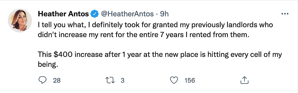 She stated, “I tell you what, I definitely took for granted my previously [sic] landlords who didn’t increase my rent for the entire 7 years I rented from them. This $400 increase after 1 year at the new place is hitting every cell of my being.”