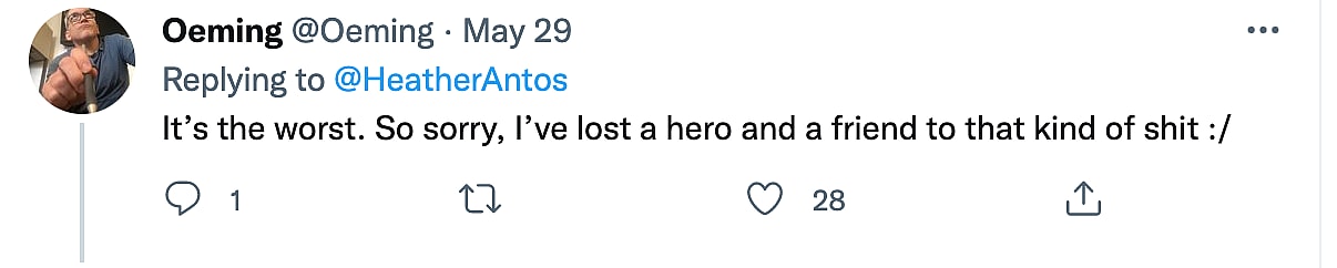 Michael Avon Oeming, who co-created Powers with Brian Michael Bendis, tweeted, “It’s the worst. So sorry, I’ve lost a hero and a friend to that kind of shit.”