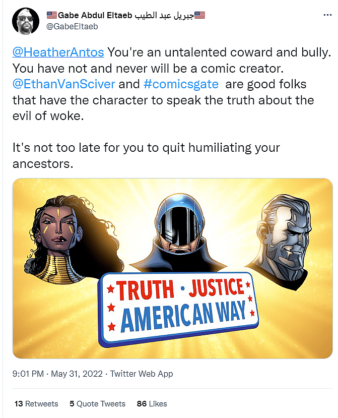 Eltaeb, who has currently raised over $62,000 for his Truth Justice American Way, would react to Antos’ comments with his own thread, which he began, “Heather Antos, you’re an untalented coward and bully. You have not and never will be a comic creator.”