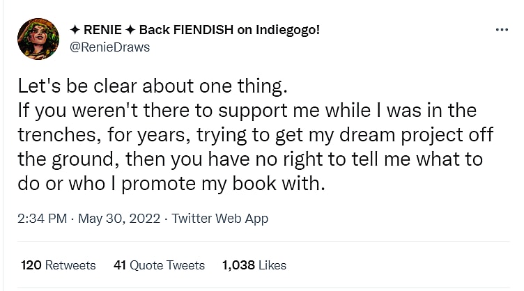 Strychalski, who is starting her crowdfunding campaign for Fiendish: Chapter 2: Origins, seemingly responded to Antos with her own thread writing, “Let me be clear about one thing. If you weren’t there to support me while I was in the trenches, for years, trying to get my dream project off the ground, then you have no right to tell me what to do or who I promote my book with.”