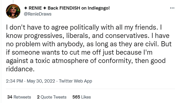 “I don’t have to agree politically with all my friends,” she continued. “I know progressives, liberals, and conservatives. I have no problem with anybody, as long as they are civil. But if someone wants to cut me off just because I’m against a toxic atmosphere of conformity, then good riddance.”
