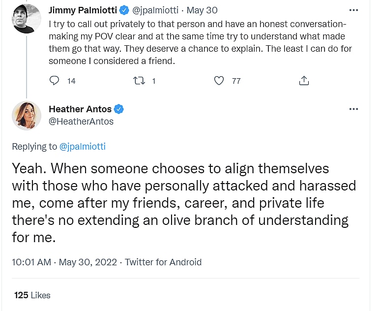 In response to Jimmy Palmiotti, known for his work on Harley Quinn at DC Comics, Antos further stated, “Yeah. When someone chooses to align themselves with those who have personally attacked and harassed me, come after my friends, career, and private life there’s no extending an olive branch of understanding.”