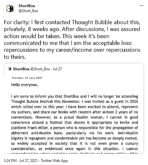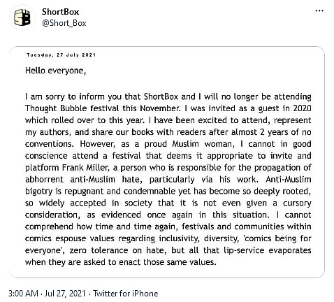 Though Miller’s initial invitation announcement seemed to come and go without any incident, on July 27th, award-winning cartoonist and small press publisher ShortBox founder Zainab Akhtar revealed that they would “no longer be attending Thought Bubble festival this November” in protest of Miller’s attendance.