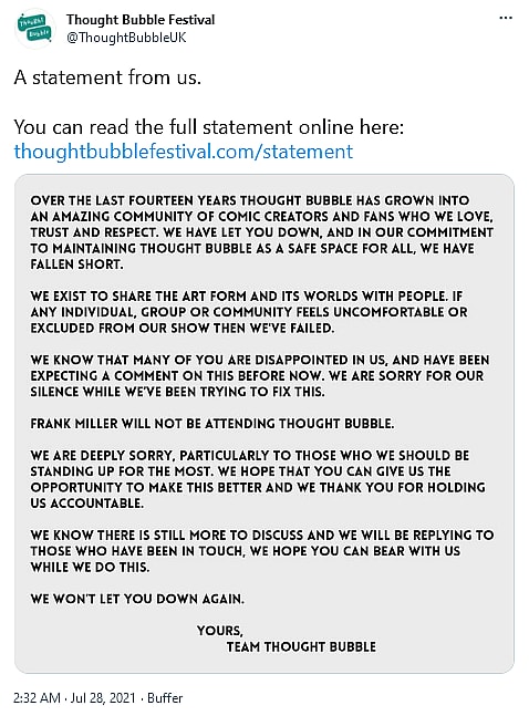 “We know that many of you are disappointed in us, and have been expecting a comment on this before now,” they continued. “We are sorry for our silence while we’ve been trying to fix this. Frank Miller will not be attending Thought Bubble.”