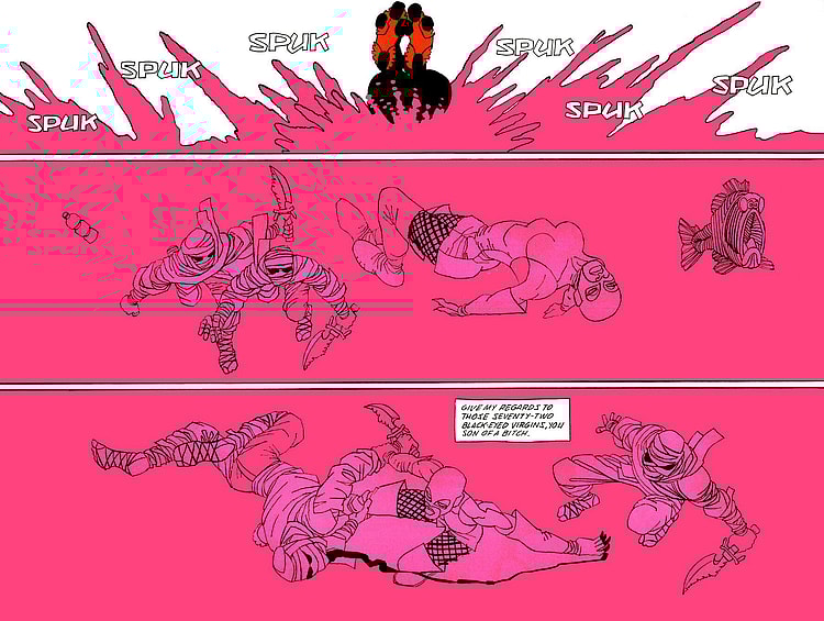 “When I look at Holy Terror, which I really don’t do all that often, I can really feel the anger ripple out of the pages. There are places where it is bloodthirsty beyond belief,” Miller told The Guardian’s Sam Thielman in 2018. “I don’t want to go back and start erasing books I did,” he replies. “I don’t want to wipe out chapters of my own biography. But I’m not capable of that book again.”
