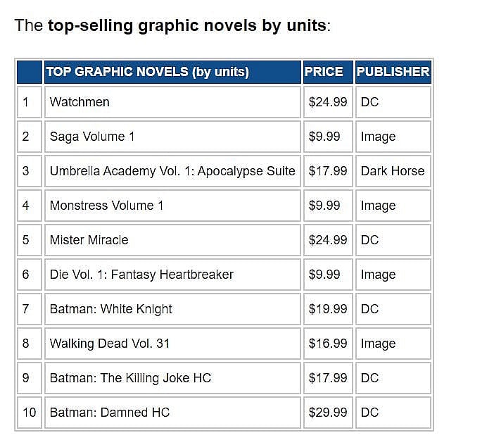 And Gallo might be on to something. If you look at Comichron’s data for the top selling graphic novels by units only 4 out of the top 10 are actually new stories, and none of the new stories crack the top 4. And none of the top 10 books are from Marvel Comics.