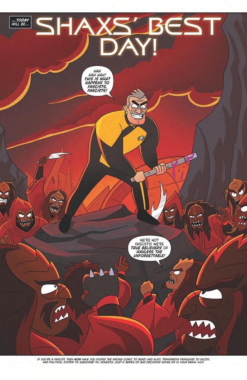 On the book’s second page, the main character Shaxs starts ranting about “fascists” to the Klingons. “This is what happens to fascists, fascists,” he says in eye-rollingly cringe dialogue.
