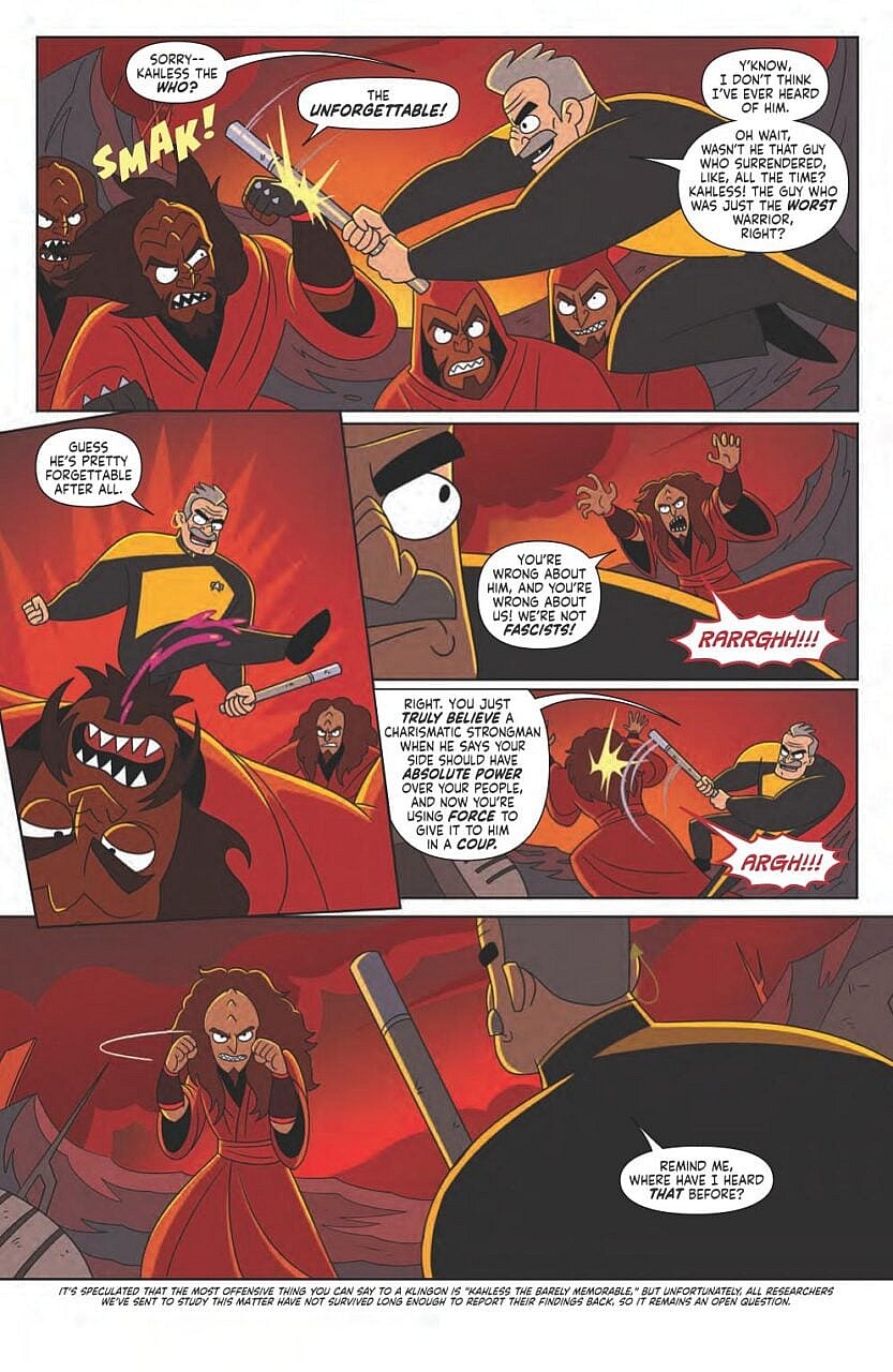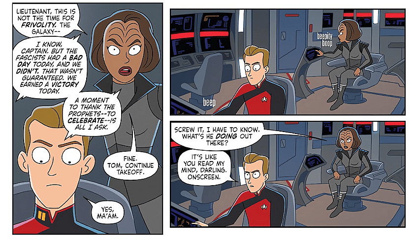 It’s clear the writer meant to chastise fans who might vote differently than him, or support right-wing politicians to the point where he warns them they have no place even watching Star Trek. Not only that, but condescending readers that they’d better agree with his politics or they’re making bad life choices is beyond arrogant. It destroys any sense of immersion in the comic, forcing readers to stop and focus on these odd notes on every page. This is the job of an editor to make sure a writer is reined in, especially when dealing with a beloved franchise like Star Trek.