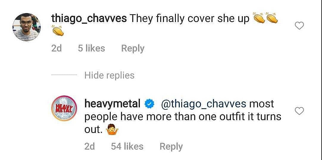 Heavy Metal responded, “Most people have more than one outfit it turns out.”