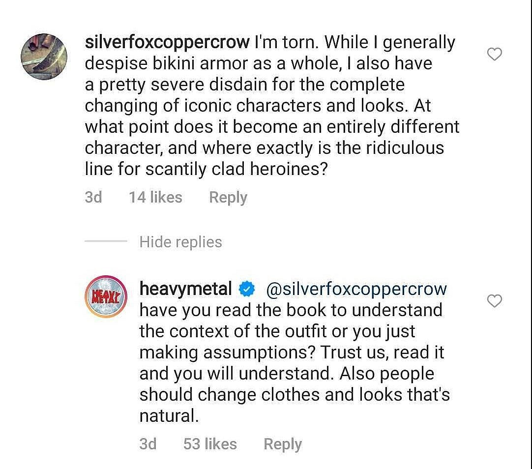 Heavy Metal responded, “Think about your question realistically. You are an adult (we assume) would it make sense for a company that works so hard to create and bring new art to hate it’s fans? Or are you just uncomfortable with change and growth? Do you hate us because we’ve grown out of the box and your comfort level. Sit with that. We love our fans but they can either grow up with or stay behind clinging to an idealized past.”
