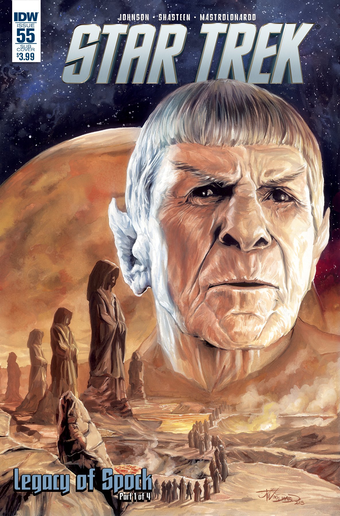 This all-new story set in the universe of the new STAR TREK films celebrates the life of the most iconic character of them all: Leonard Nimoy’s SPOCK. In Part 1 of this 4-part epic, the elder Spock joins the last survivors of Vulcan to search the galaxy for a new homeworld! Don’t miss this special series, part of the 50th Anniversary Celebration of the STAR TREK franchise!