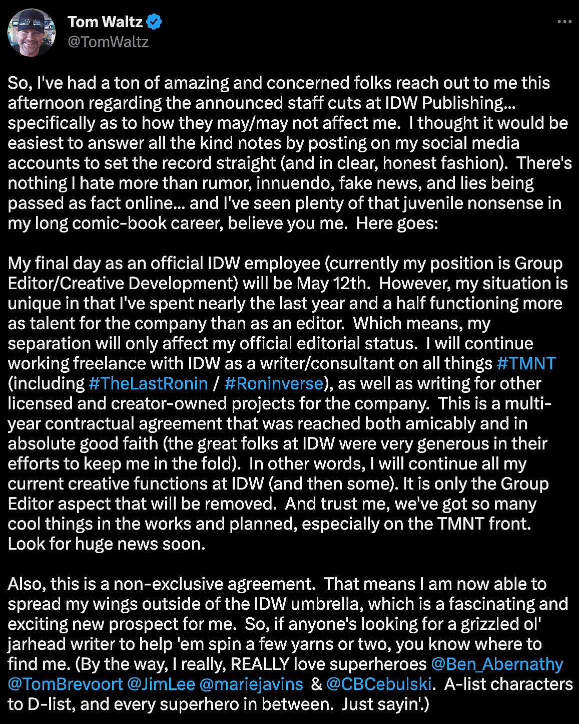 He wrote, “My final day as an official IDW employee (currently my position is Group Editor/Creative Development) will be May 12th. However, my situation is unique in that I’ve spent nearly the last year and a half functioning more as talent for the company than as an editor. Which means, my separation will only affect my official editorial status. I will continue working freelance with IDW as a writer/consultant on all things #TMNT (including #TheLastRonin / #Roninverse), as well as writing for other licensed and creator-owned projects for the company.”