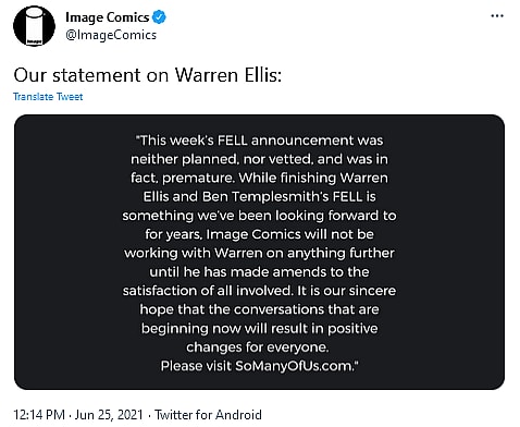 “While finishing Warren Ellis and Ben Templesmith’s Fell is something we’ve been looking forward to for years, Image Comics will not be working with Warren on anything further until he has made amends to the satisfaction of all involved,” the publisher added. “It is our sincere hope that the conversations that are beginning now will result in positive changes for everyone. Please visit SoManyOfUs.com.”