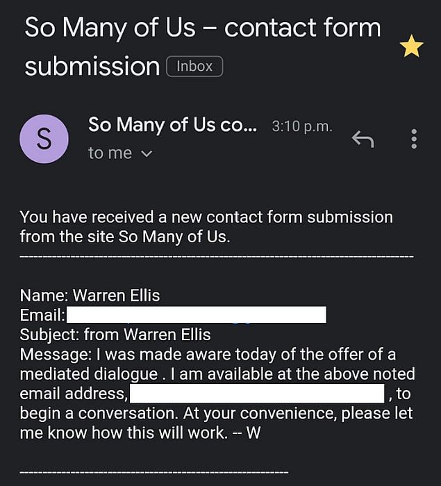 “I was made aware today of the offer of a mediated dialogue,” wrote Ellis, as seen in a contact form submission submitted by the author to and shared by SoManyOfUs.com. “I am available at the above noted email address, [redacted], to begin a conversation. At your convenience, please let me know how this will work.”