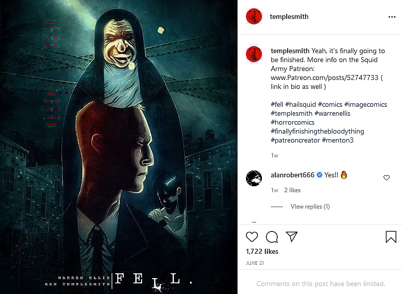The events which prompted Image’s first statement on the accusations against Ellis began on June 21st when Templesmith, taking to his personal Instagram account, shared an image featuring series protagonist Detective Richard Fell and announced, “Yeah, it’s finally going to be finished.”