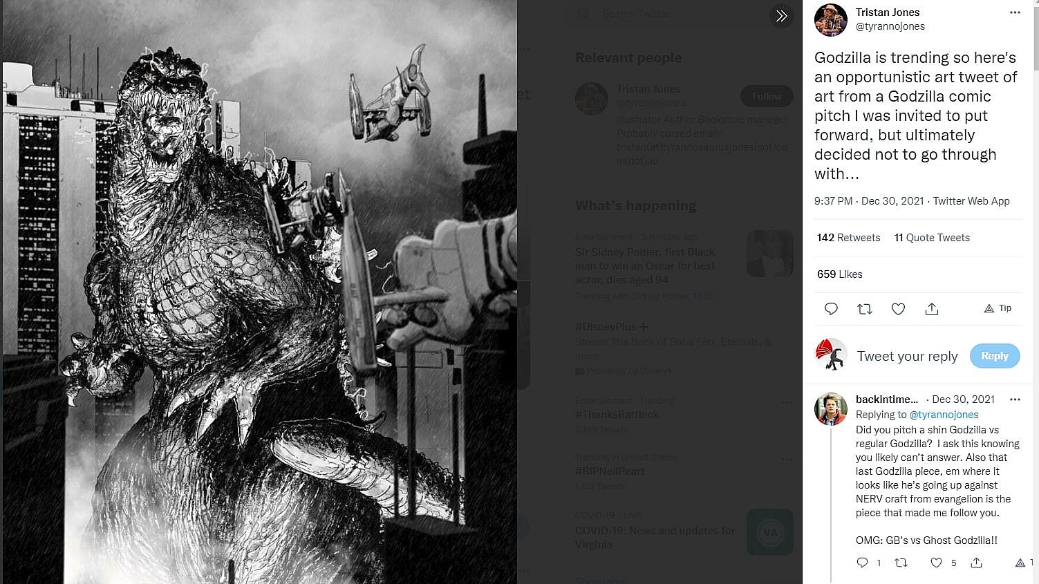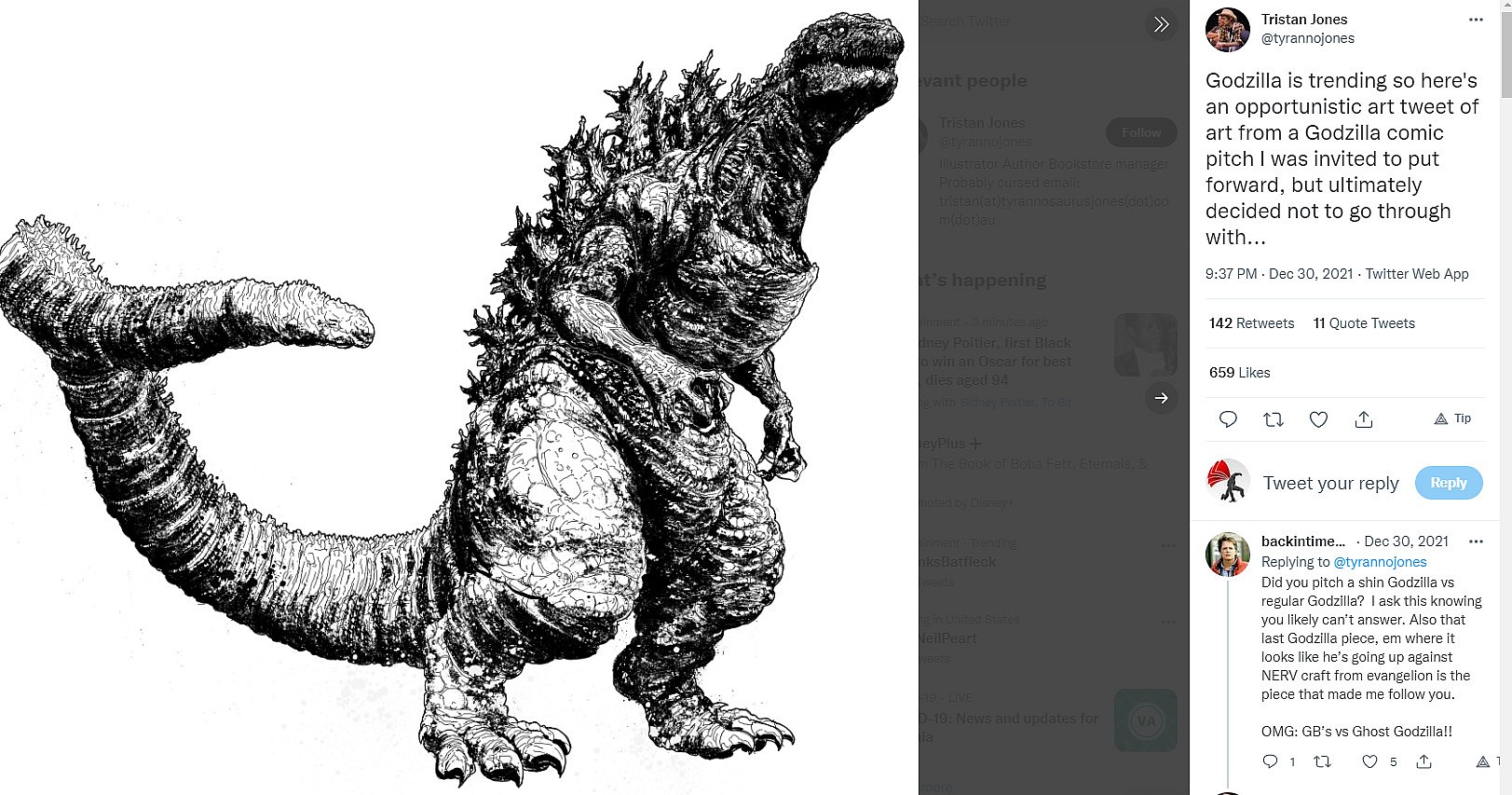 “Godzilla is trending so here’s an opportunistic art tweet of art from a Godzilla comic pitch I was invited to put forward, but ultimately decided not to go through with,” he wrote.