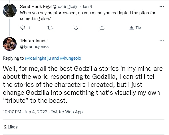 After sharing his artwork, Jones was asked if his idea was Shin vs. another Godzilla from a previous era but that wasn’t the case since he couldn’t use the Reiwa relaunch version at all.