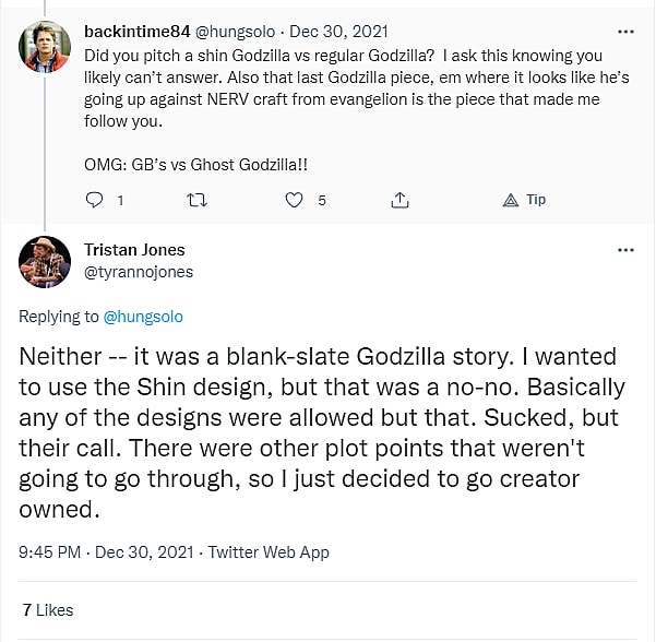 “Neither — it was a blank-slate Godzilla story,” Jones replied. “I wanted to use the Shin design, but that was a no-no. Basically any of the designs were allowed but that. Sucked, but their call. There were other plot points that weren’t going to go through, so I just decided to go creator owned.”