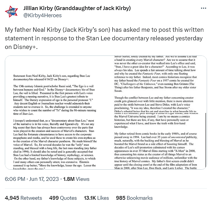 Kirby reacted to the documentary with his daughter Jillian Kirby, the granddaughter of Jack Kirby sharing her father’s open letter to Twitter. Jillian wrote, “My father Neal Kirby (Jack Kirby’s son) has asked me to post this written statement in response to the Stan Lee documentary released yesterday on Disney+.