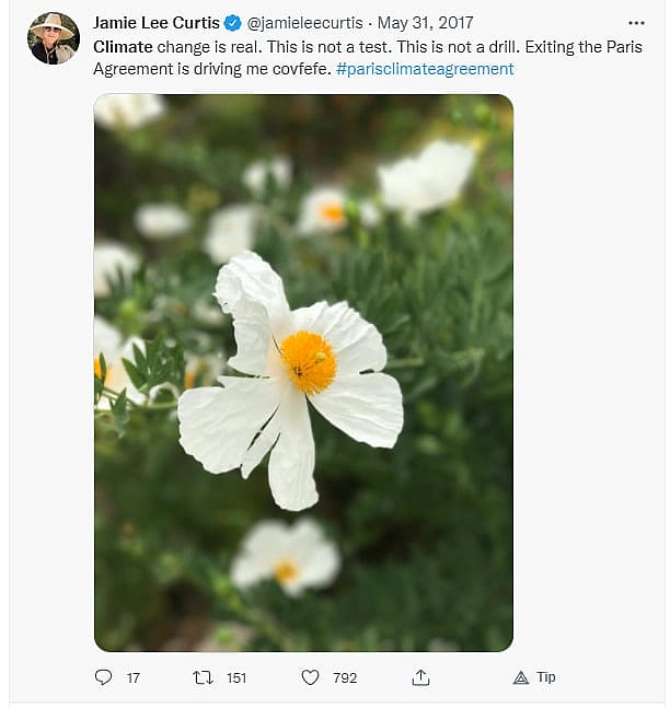 Curtis has not hidden her views on climate change. In May 2017 she declared, “Climate change is real. This is not a test. This is not a drill. Exiting the Paris Agreement is driving me covfefe.”