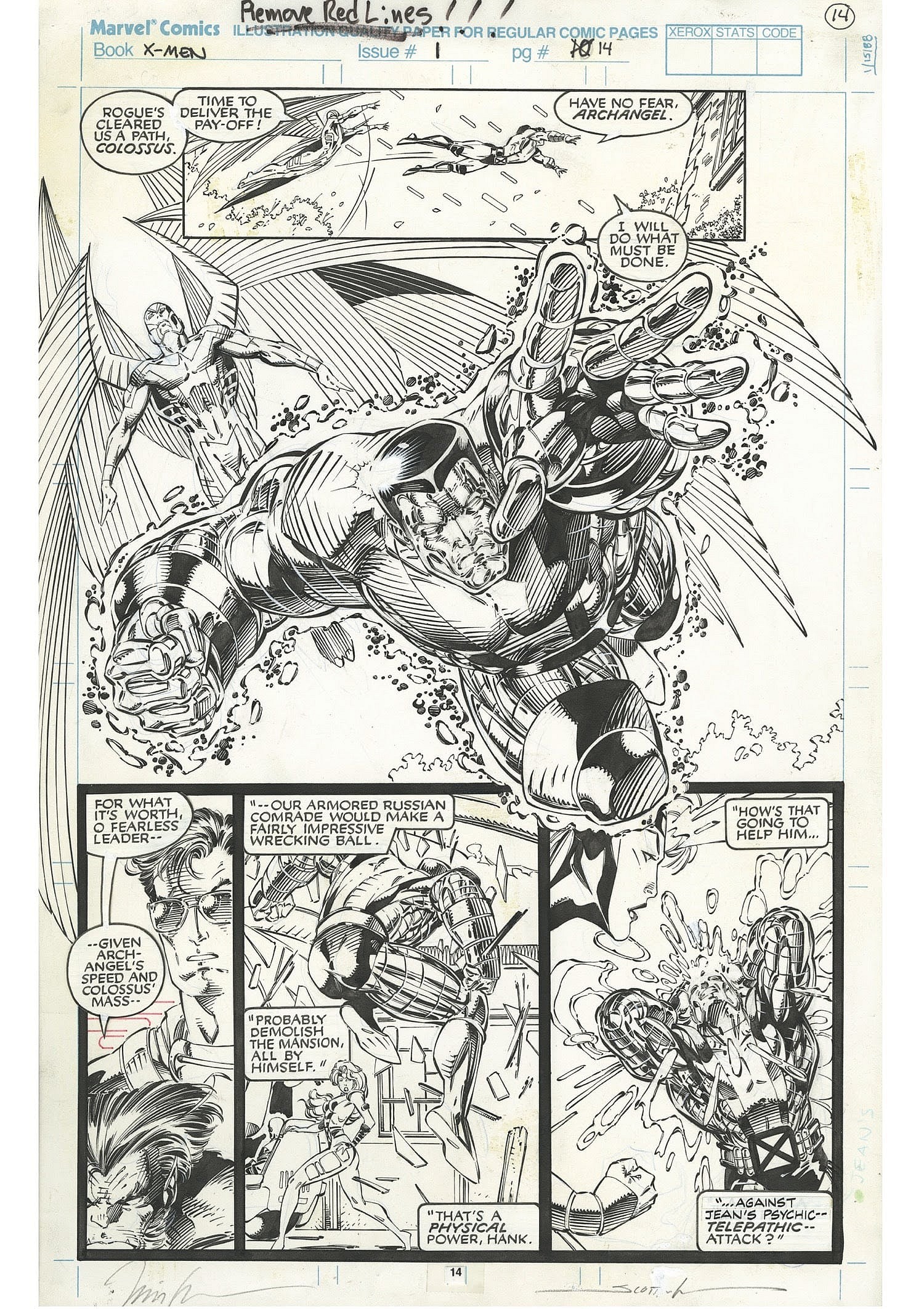 The Artist’s Edition includes every single page from Claremont and Lee’s X-Men #1 that debuted back in 1991. It also includes 100 other examples of Lee’s artwork including ” covers, splashes, pin-ups, interior pages, and trading cards, as well as a double foldout of all four X-Men #1 connecting covers.”