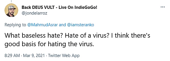 Flying Sparks author Jon Del Arroz would retort, “What baseless hate? Hate of a virus? I think there’s a good basis for hating the virus.”