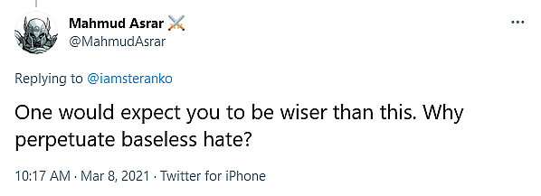 In response to comic book artist Mahmud Asur, who tweeted to Steranko, “One would expect you to be wiser than this. Why perpetuate baseless hate?”
