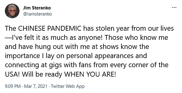 On March 8th, Steranko tweeted, “The CHINESE PANDEMIC has stolen a year from our lives — I’ve felt it as much as anyone! Those who know me and have hung out with me at shows know the importance I lay on personal appearances and connecting at gigs with fans from every corner of the USA! Will be ready WHEN YOU ARE!”