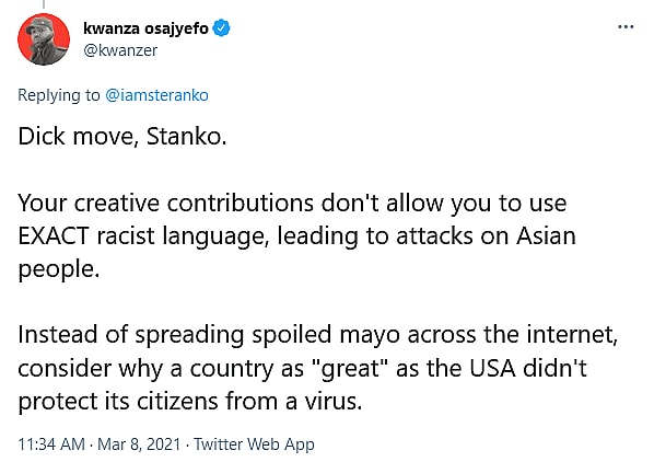 “D–k move, Stanko,” said comic book author Kwanza Osajyefo (whose account bears a blue check mark for some inexplicable reason). ” Your creative contributions don’t allow you to use EXACT racist language, leading to attacks on Asian people. Instead of spreading spoiled mayo across the internet, consider why a country as ‘great’ as the USA didn’t protect its citizens from a virus.”