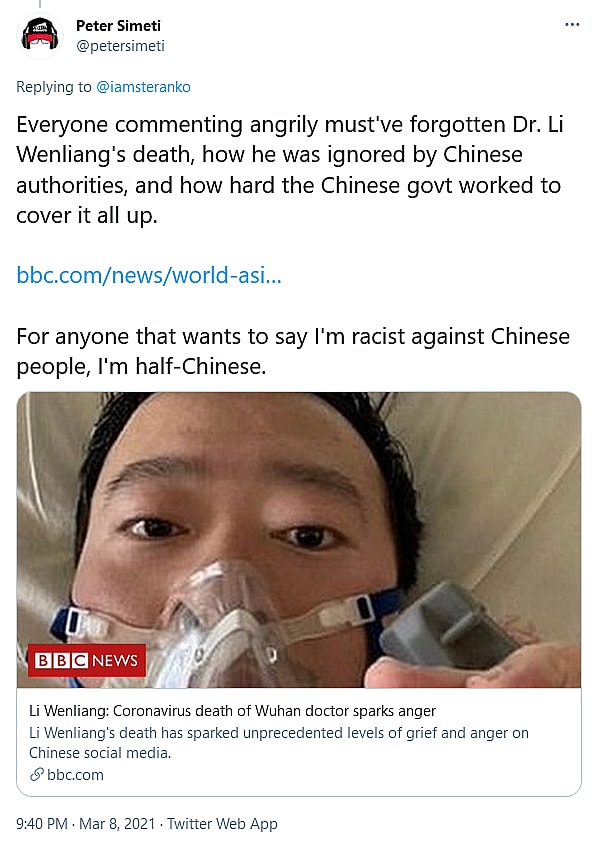 However, Steranko was not without his defenders, including Alterna Comics founder Peter Simeti, who in Steranko’s defense pointed asserted that “everyone commenting angrily must’ve forgotten Dr. Li Wenliang’s death, how hard he was ignored by Chinese authorities, and how hard the Chinese govt worked to cover it all up.