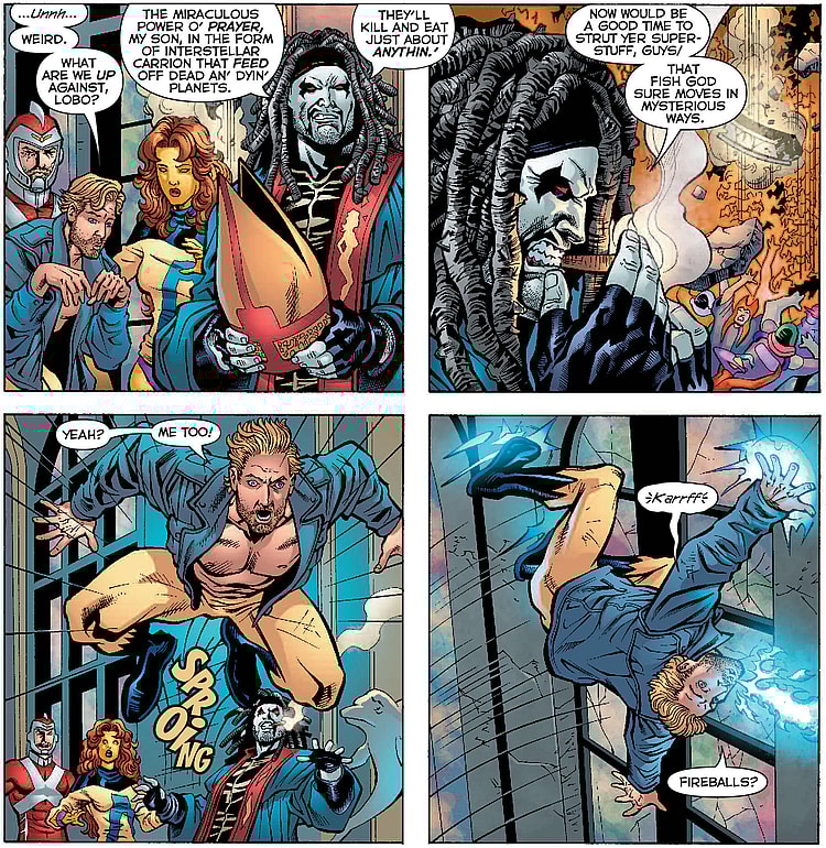 Lobo/Animal Man: Scorched Earth: Lobo. The name makes entire alien races collectively wet themselves with fear. The Main Man is proudly hyper-violent, arrogant, loud, stubborn, impatient, and ill-tempered. The best thing about him is that after he completes his contract, he leaves. Until now…