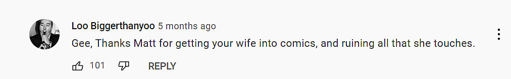 The top comment is from 5 months ago before the article was published. It reads, “Gee, Thanks Matt for getting your wife into comics, and ruining all that she touches..”