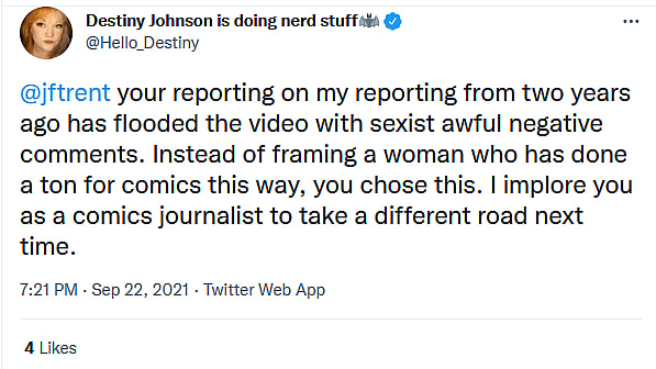 Johnson then specifically tweeted at myself writing, “John F. Trent your reporting on my reporting from two years ago has flooded the video with sexist awful negative comments. Instead of framing a woman who has done a ton for comics this way, you chose this.”