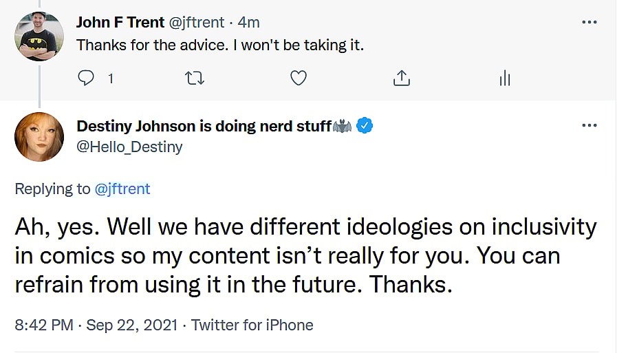 She wrote, “Ah, yes. Well we have different ideologies on inclusivity in comics so my content isn’t really for you. You can refrain from using it in the future. Thanks.”