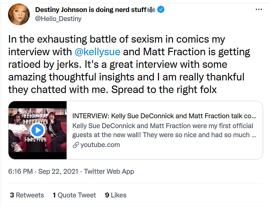 She wrote, “In the exhausting battle of sexism in comics my interview with Kelly Sue DeConnick and Matt Fraction is getting ratioed by jerks.”