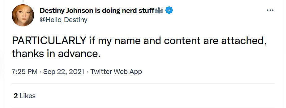 In a subsequent tweet she added, “PARTICULARLY if my name and content are attached, thanks in advance.”