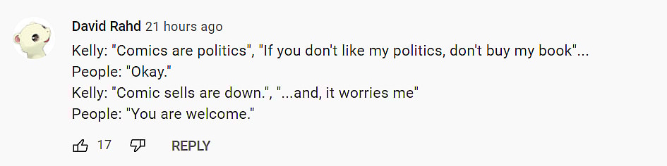 The fifth comment and the first one that could have been inspired by our article states, “Kelly: ‘Comics are politics’, ‘If you don’t like my politics, don’t buy my book’… People: ‘Okay.’ Kelly: ‘Comic sells are down.’, ‘…and, it worries me’ People: ‘You are welcome.'”