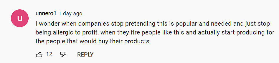 The next comment states, “I wonder when companies stop pretending this is popular and needed and just stop being allergic to profit, when they fire people like this and actually start producing for the people that would buy their products.”