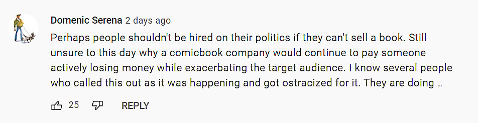 The next comment states, “Perhaps people shouldn’t be hired on their politics if they can’t sell a book. Still unsure to this day why a comicbook company would continue to pay someone actively losing money while exacerbating the target audience. I know several people who called this out as it was happening and got ostracized for it. They are doing …”