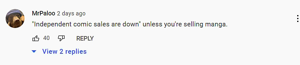 “Independent comic sales are down” unless you’re selling manga,” reads another.