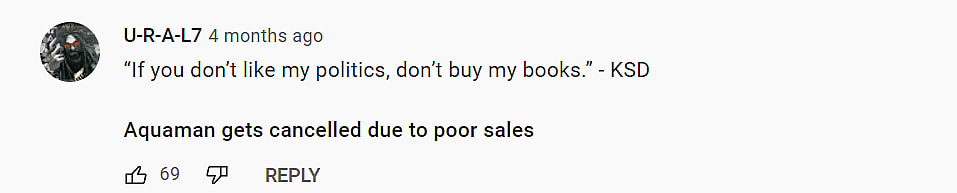 The next comment, from 4 months ago, states, ““If you don’t like my politics, don’t buy my books.’ – KSD Aquaman gets cancelled due to poor sales.”