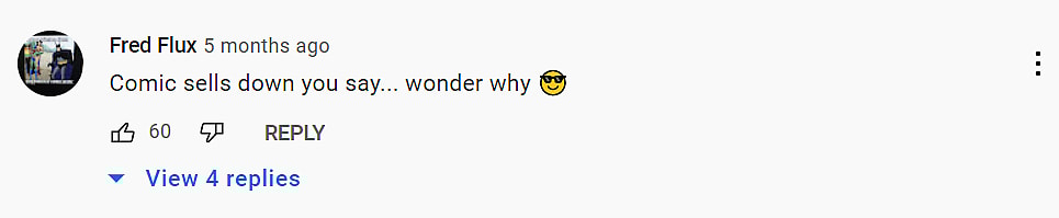 The fourth comment, from 5 months ago, says, “Comic sells down you say… wonder why 😎”