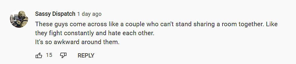 “These guys come across like a couple who can’t stand sharing a room together. Like they fight constantly and hate each other. It’s so awkward around them,” reads the next comment.