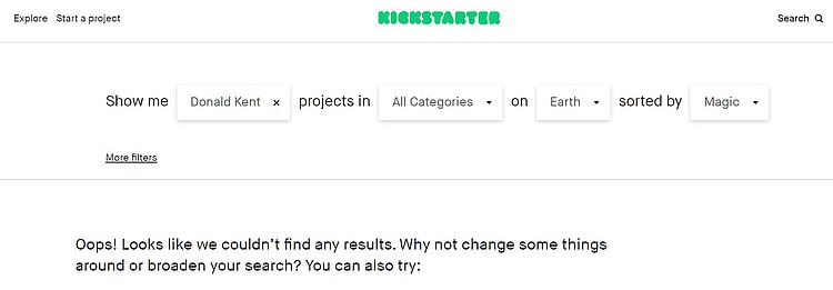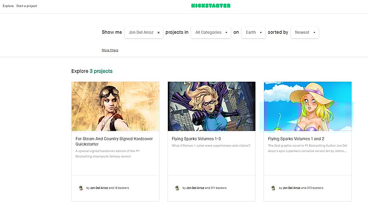 Similarly, if you search Jon Del Arroz, the campaign does not show. Although three previous campaigns do appear.